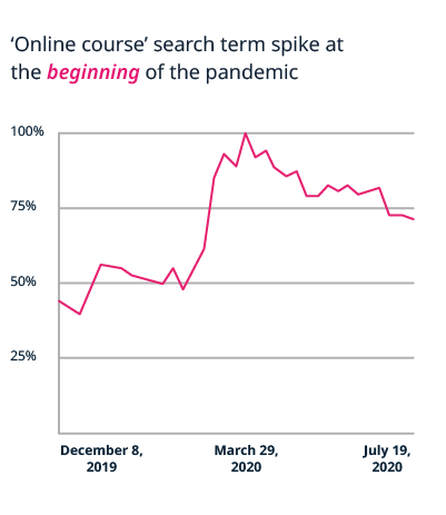 The uncertainty that COVID-19 has placed on careers has shone a spotlight on the need for people to remain adaptive in the face of change. As a result, there’s been a surge in professionals prioritizing upskilling as a way to prepare. This was especially prevalent in the beginning of the pandemic, where there was a significant spike in interest for online courses.13