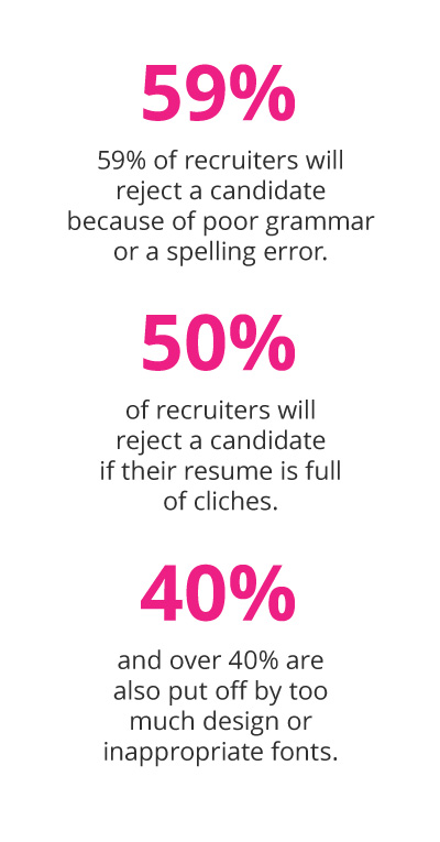 Here are the facts: 59% of recruiters will reject a candidate because of poor grammar or a spelling error. 50% of recruiters will reject a candidate if their resume is full of cliches. And over 40% are also put off by too much design or inappropriate fonts.1