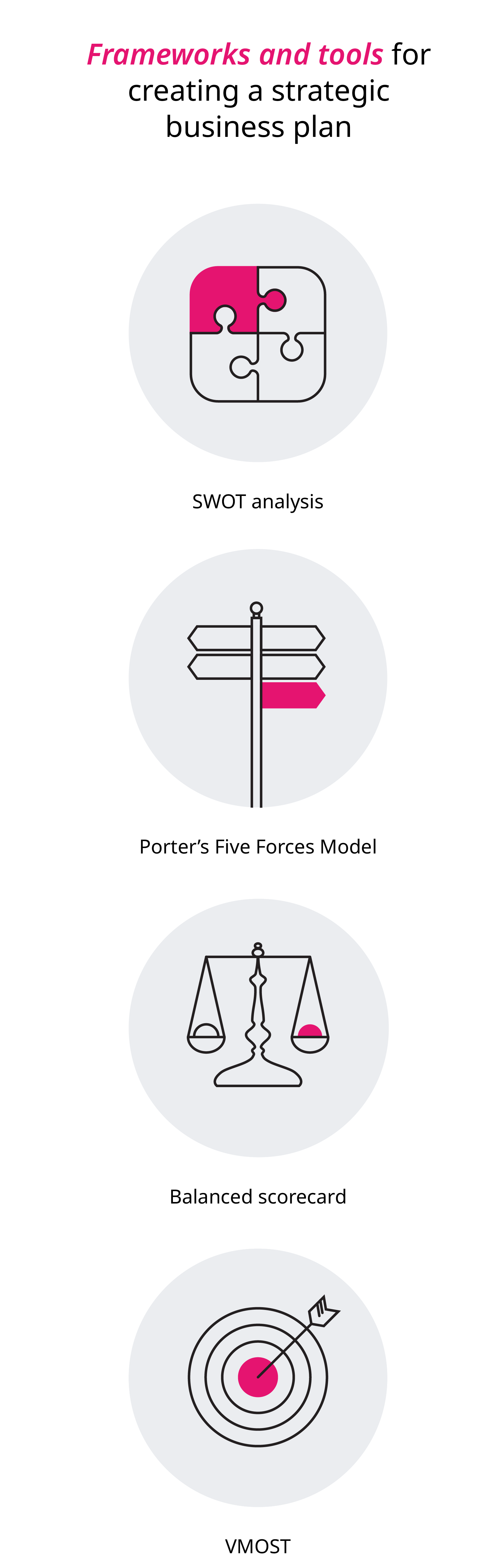 Below are four of the most common frameworks and tools used for building a strategic business plan: