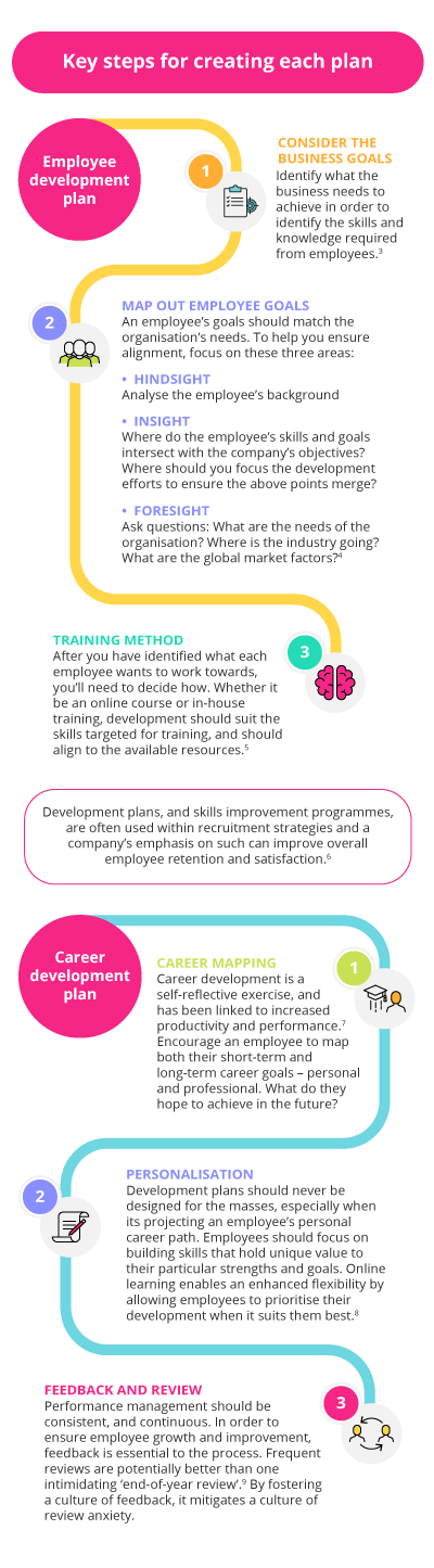 Although similar, these two plans have distinctly different methods and purposes. An employee development plan focuses on the development of an employee’s skills, and is often aligned to larger business growth and goals. This plan is more focused on skills gain, identified by the talent developer according to hiring needs or business skills gaps.1