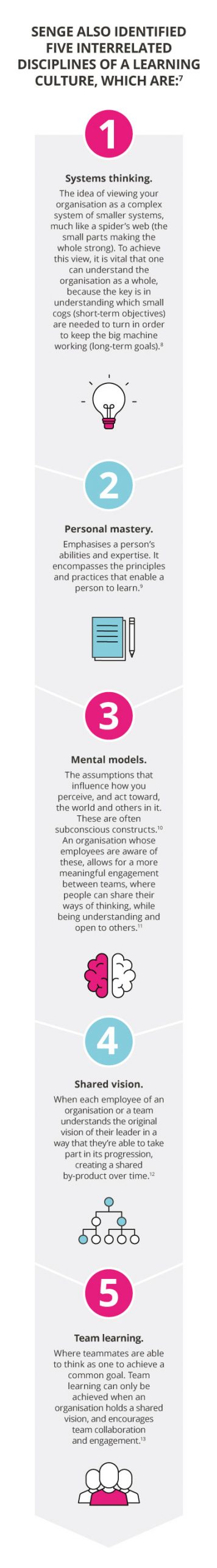 - 13 Foster, L. (May, 2017). ‘The fifth discipline – shared vision and team learning’. Retrieved from Cortex Leadership.