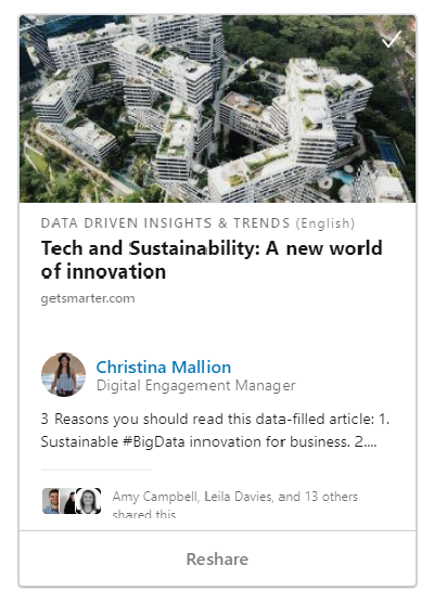 Content marketing is different from social media marketing as it houses its own content, whereas social media networks link back to this content (or a product or service) on the website. GetSmarter uses these social media platforms: Facebook, Twitter, Instagram and LinkedIn, to promote the online short courses that we offer and to share the content produced on our blog with our communities. Here is an example of the social card post for this article.