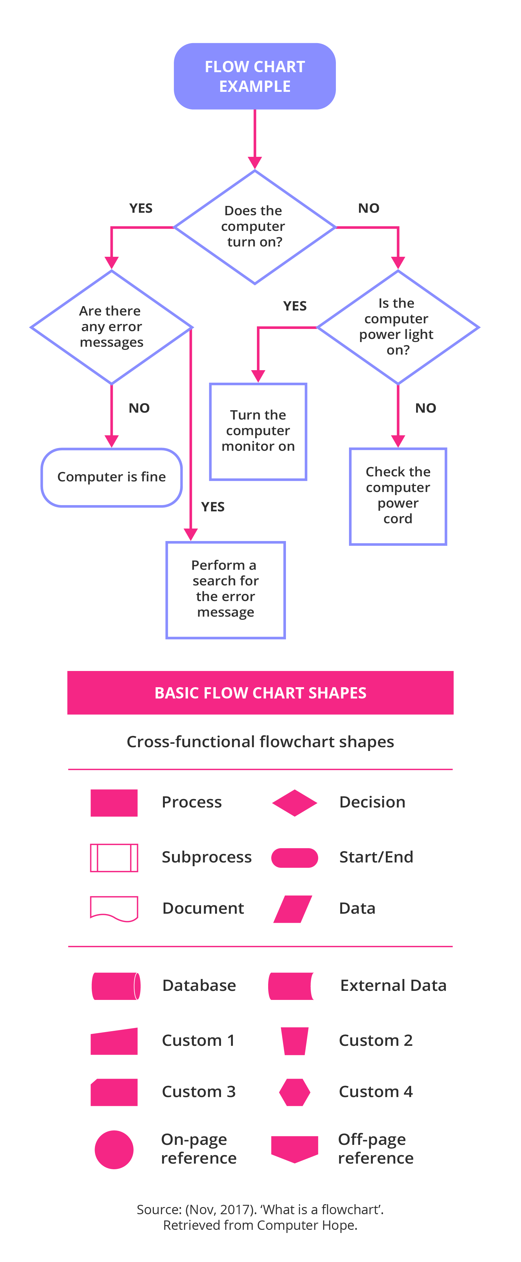 This is a generic graphic representation of a process, product, or system, which gives people involved in the project a single reference point. Flow charts use basic shapes and arrows to define relationships between steps, decisions, or data.8