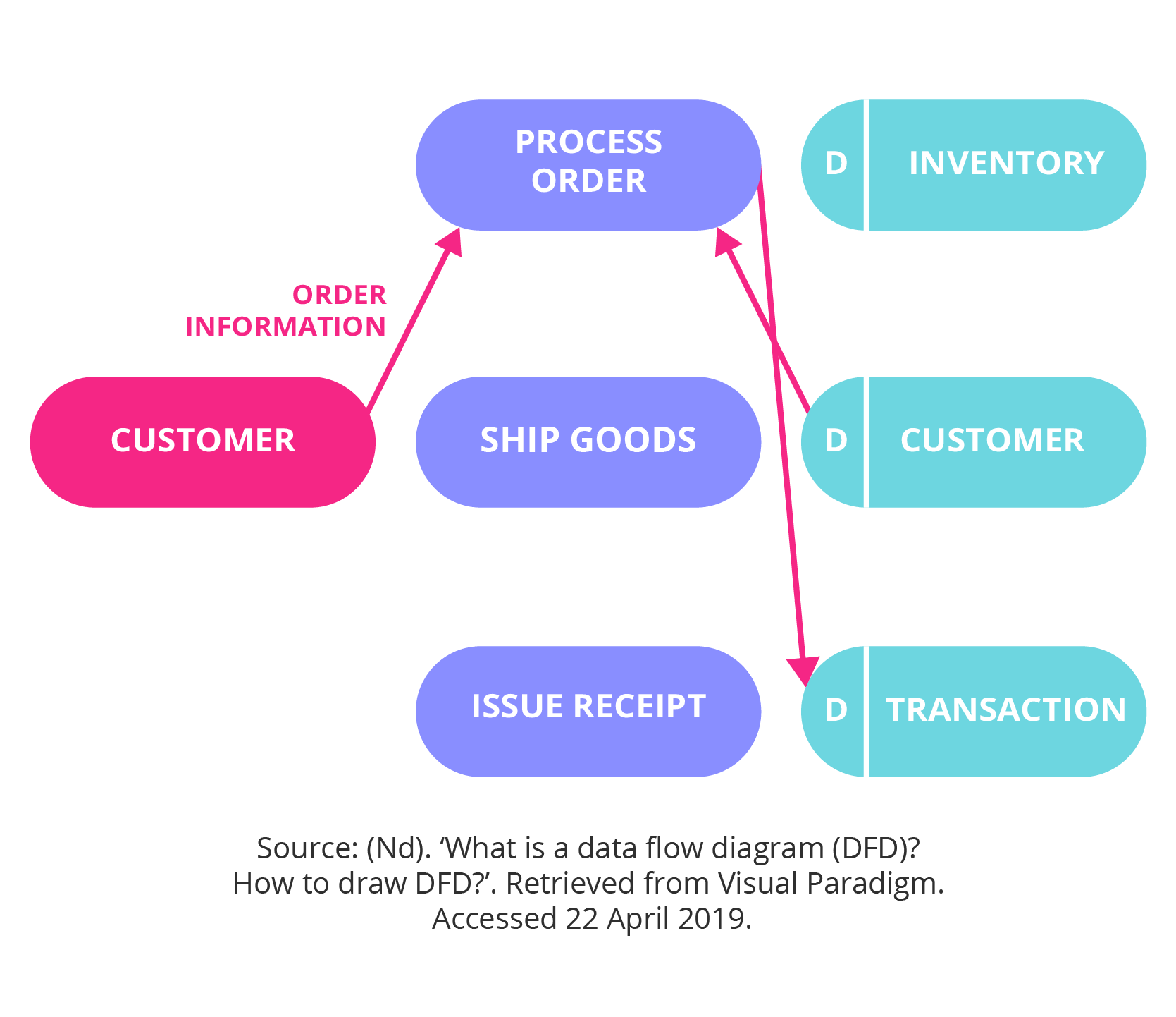 - Data flow is represented via arrows. This is the route that data takes between the external entities, process, and data stores.
