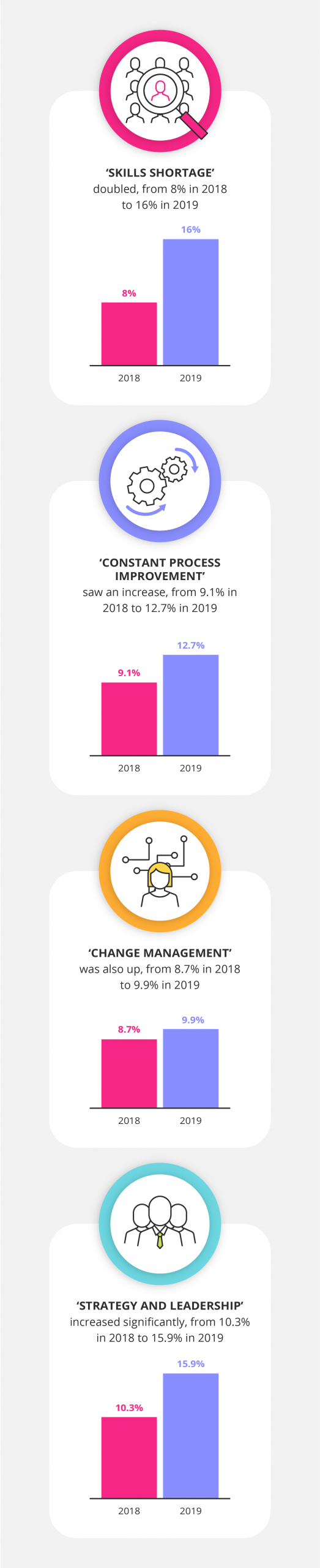 Across both the 2018 and 2019 surveys, over 75 per cent of companies agreed that there was a “high” or “very high” likelihood that their business would experience disruption as a result of new technologies. While digital disruption is considered inevitable, businesses are increasingly focused on human capital. When asked where in their organisation they experienced the most pressure from technology, the most-cited answer was “skills shortages”, which doubled from eight per cent in 2018 to 16 per cent in 2019.