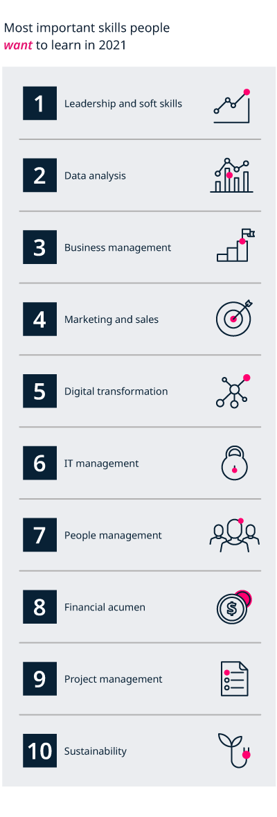 By investing in their skill sets, people are empowering themselves to become more resilient to unexpected challenges and are gaining the freedom to explore more options beyond their current nine-to-five jobs. When looking at the most important skills people want to learn in 2021 from GetSmarter’s survey, it’s clear that they’re focusing on gaining transferable skills that will equip them to work across a variety of sectors, rather than more industry-specific ones. Most notably, the majority of people rank leadership and soft skills at the top of the list.