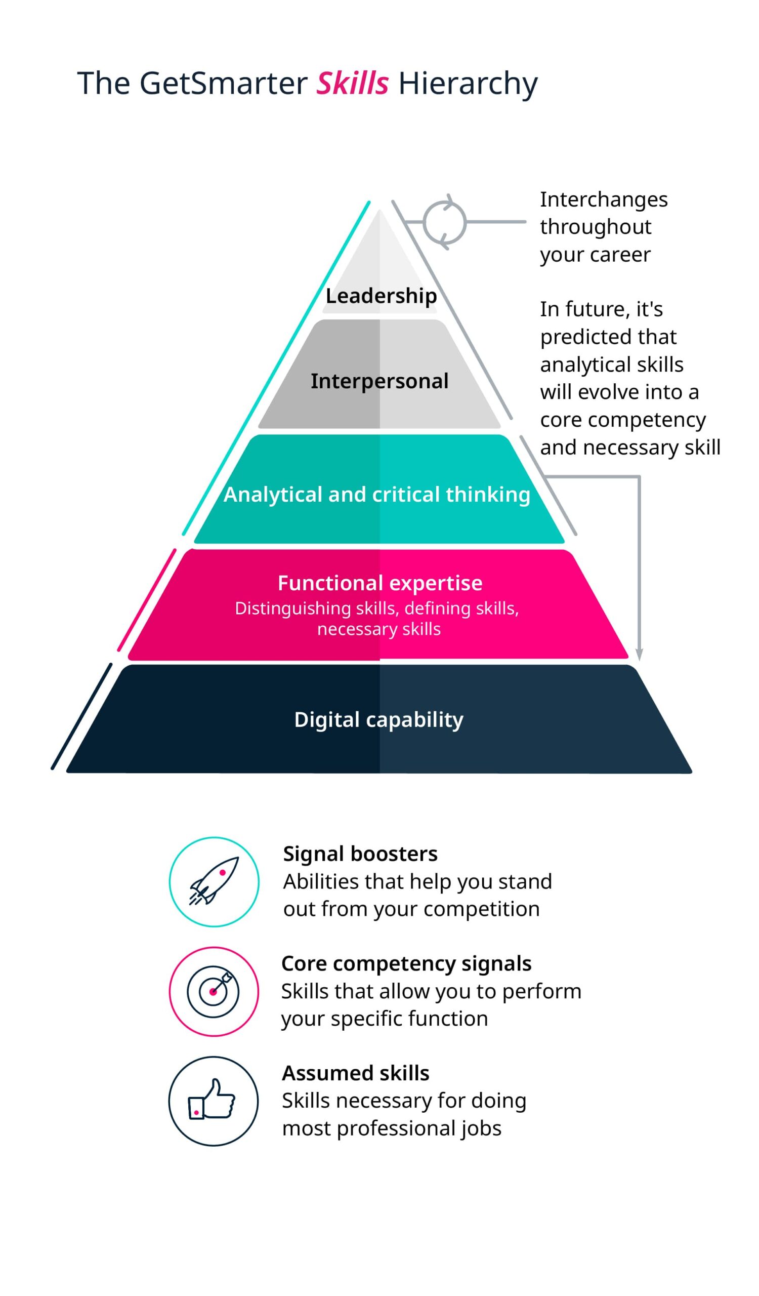GetSmarter’s ‘The Future of Work Is Here’ report shows that digital capabilities are the most important foundational skills to have, to the point where it’s become assumed knowledge for every worker. The GetSmarter Skills Hierarchy also details how data has increased the demand for analytical and critical-thinking skills across job functions and industries.