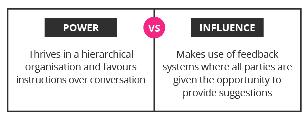 On the other hand, influence is defined as: “the ability to alter other people’s perceptions of a situation.”3 Unlike power, influence makes use of positive language and subtle behaviours to encourage the desired outcome.