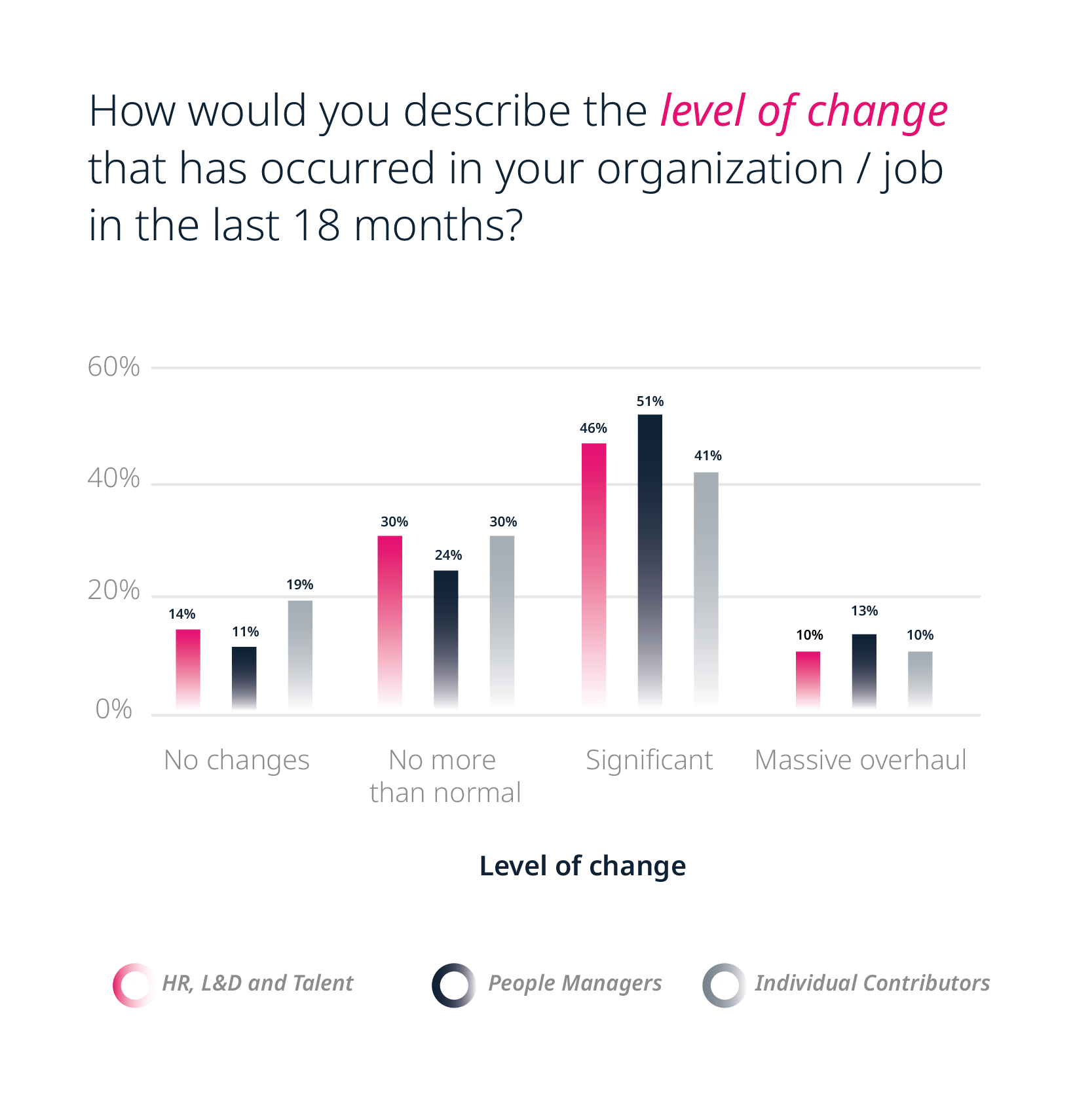 Change is happening faster and more broadly than ever could have been anticipated. This is clearly reflected in GetSmarter’s research, where most respondents profess to have already experienced significant levels of change in their organization or jobs over the last 18 months. Furthermore, respondents are expecting even more significant change to occur in the next 18 months.