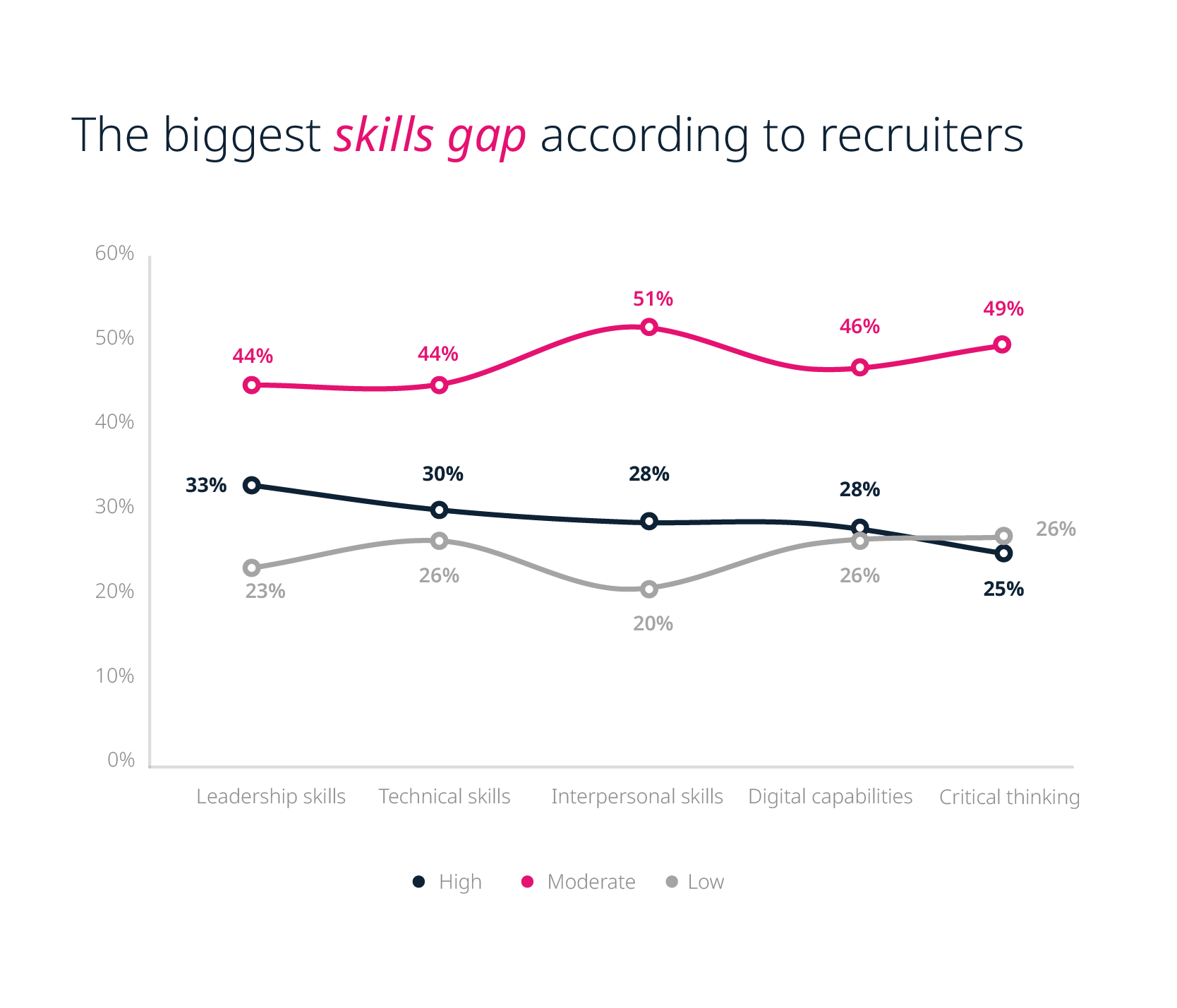 This is reflected in our research. Recruiters believe that the biggest skills gap in their organization lies in leadership. We can also see a growing demand for analytical and interpersonal skills from the respondents.