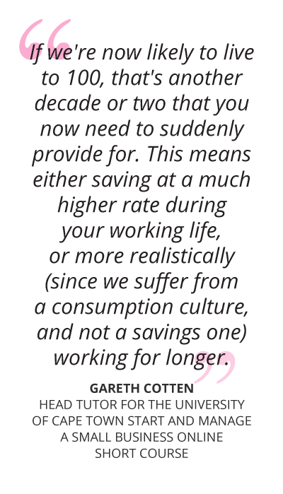 “With us now likely to live longer, we need to be cognisant of the fact that retirement savings as we know them may be insufficient. The average retirement plan is premised on someone working until 65, and then having another 15-20 years to live, with the assumption that you’ll effectively use up your savings in your lifetime,” says Gareth Cotten, Head Tutor for the University of Cape Town Start and Manage a Small Business online short course. “If we’re now likely to live to 100, that’s another decade or two that you now need to suddenly provide for. This means either saving at a much higher rate during your working life, or more realistically (since we suffer from a consumption culture, and not a savings one) working for longer.”