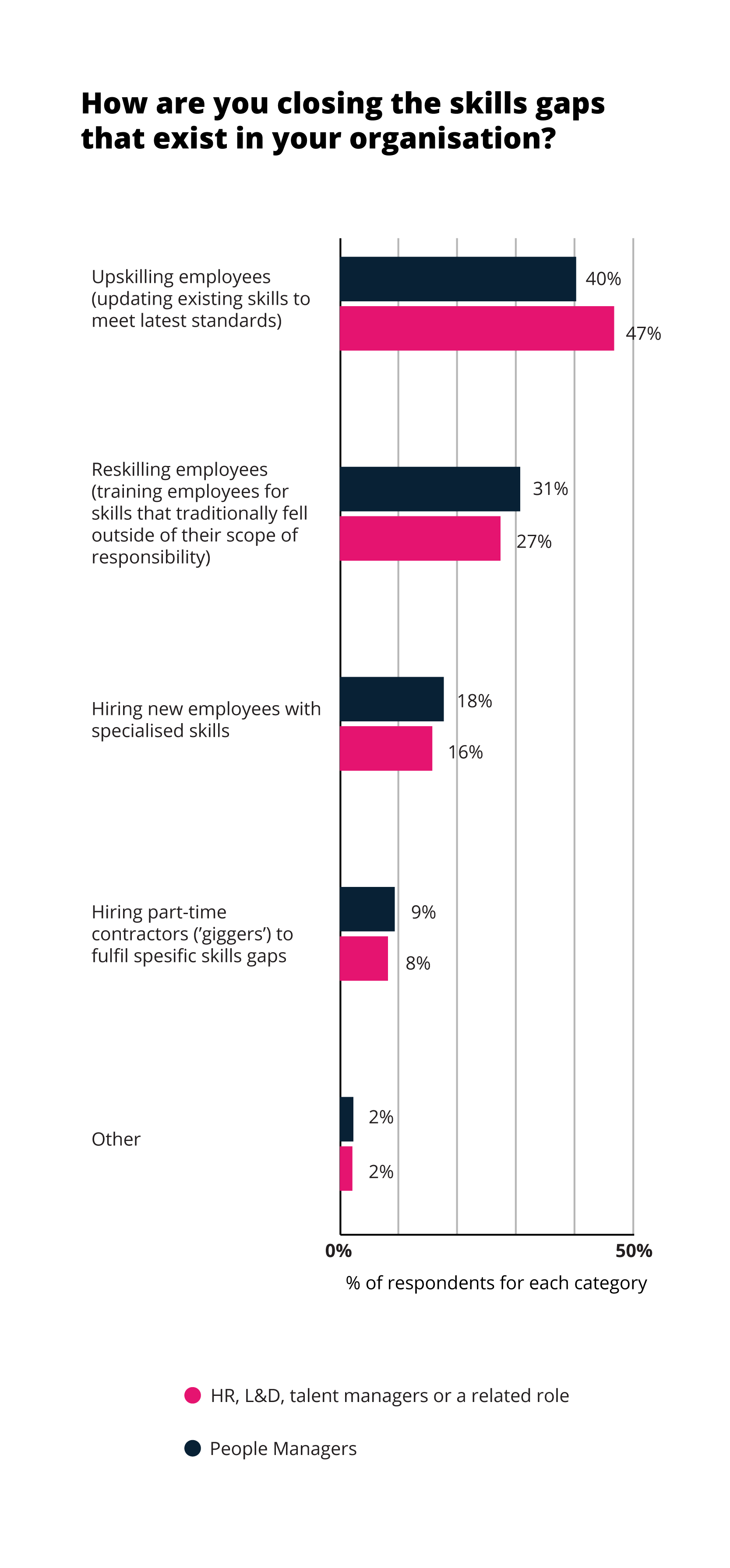 These changes all point towards a shrinking availability of suitably skilled workers. Already, millions of positions that require new skills are going unfilled around the globe as employers struggle to recruit.7 As a result, modern HR professionals are having to turn to people within their company to fill jobs. This sentiment is reflected in GetSmarter’s research: 40 per cent of HR, L&D, and talent managers, as well as 47 per cent of people managers, are choosing to upskill their teams to close skills gaps rather than hiring outside talent.