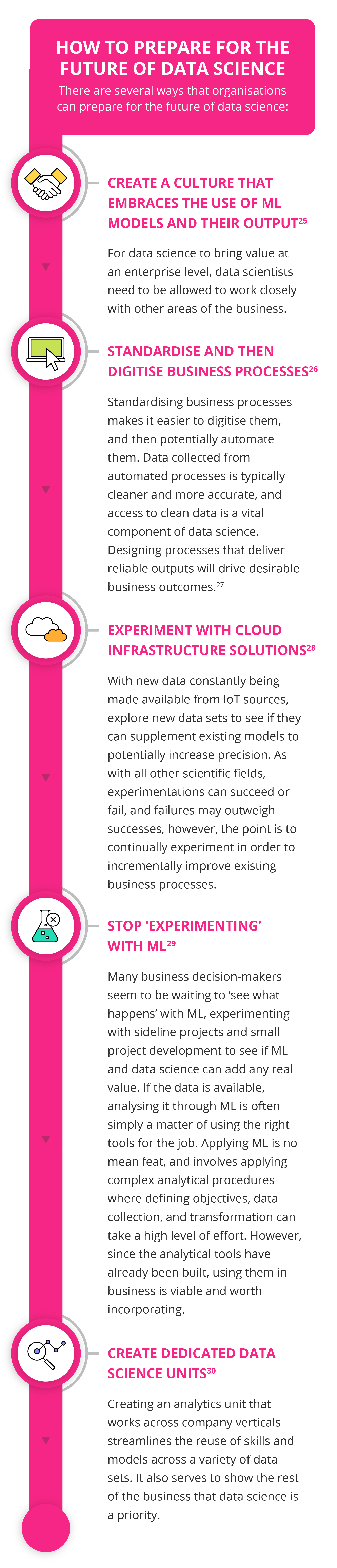 The sources of data will continue to expand as the need to harvest even greater amounts of information on customers grows. The greater access organisations have to data, the more precise and accurate the machine learning models will become. The potential applications of this data will further drive the need for data science.9 Without data science, it is difficult for organisations to access the full value from data.10
