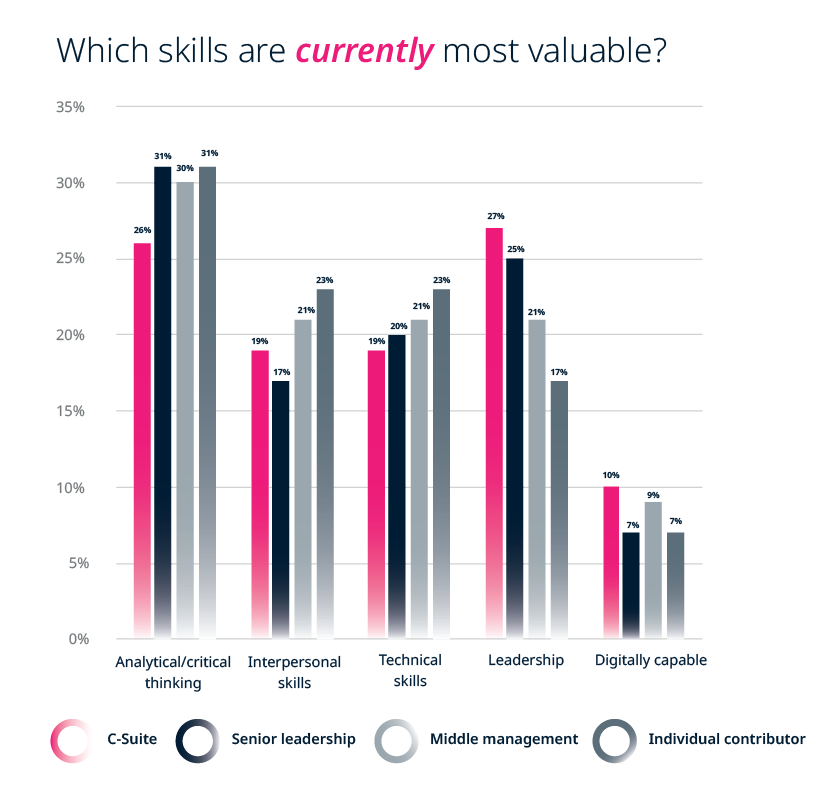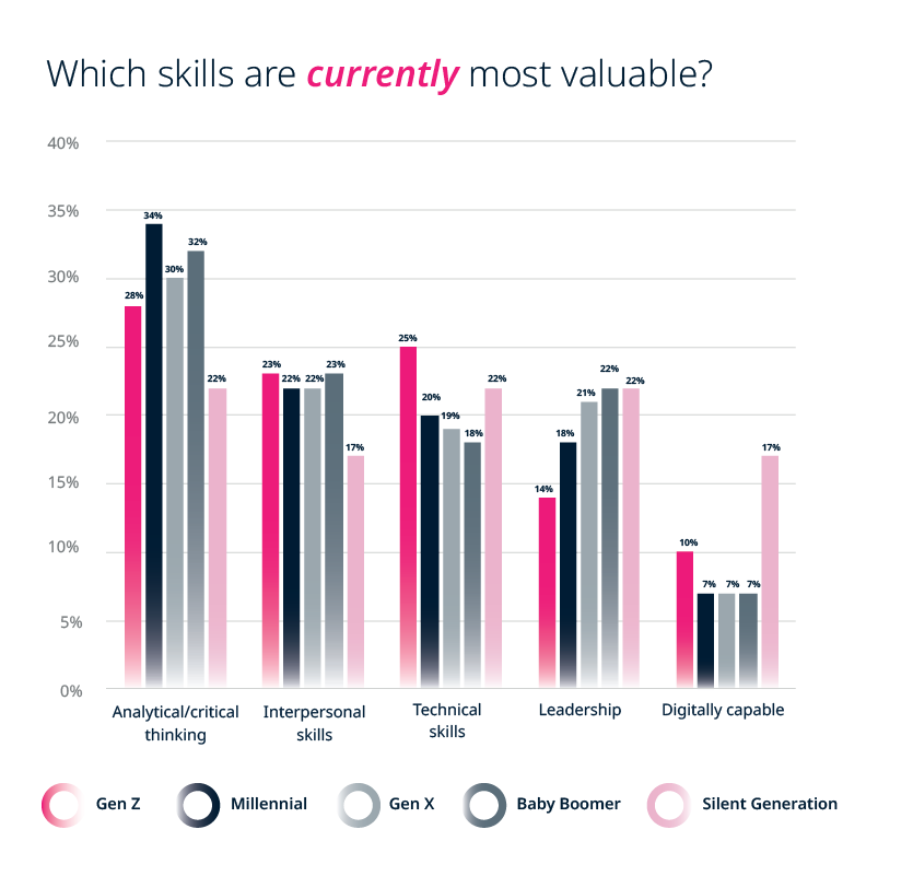 When broken down by generation, the data reveals that younger people in Generation Z perceive technical skills and digital capability as far more valuable compared to other groups. As digital natives, this is to be expected. However, they also agree that analytical and critical thinking skills hold the most value overall, followed by interpersonal skills. This shows that even the digitally native generation acknowledges the value of uniquely human skills.