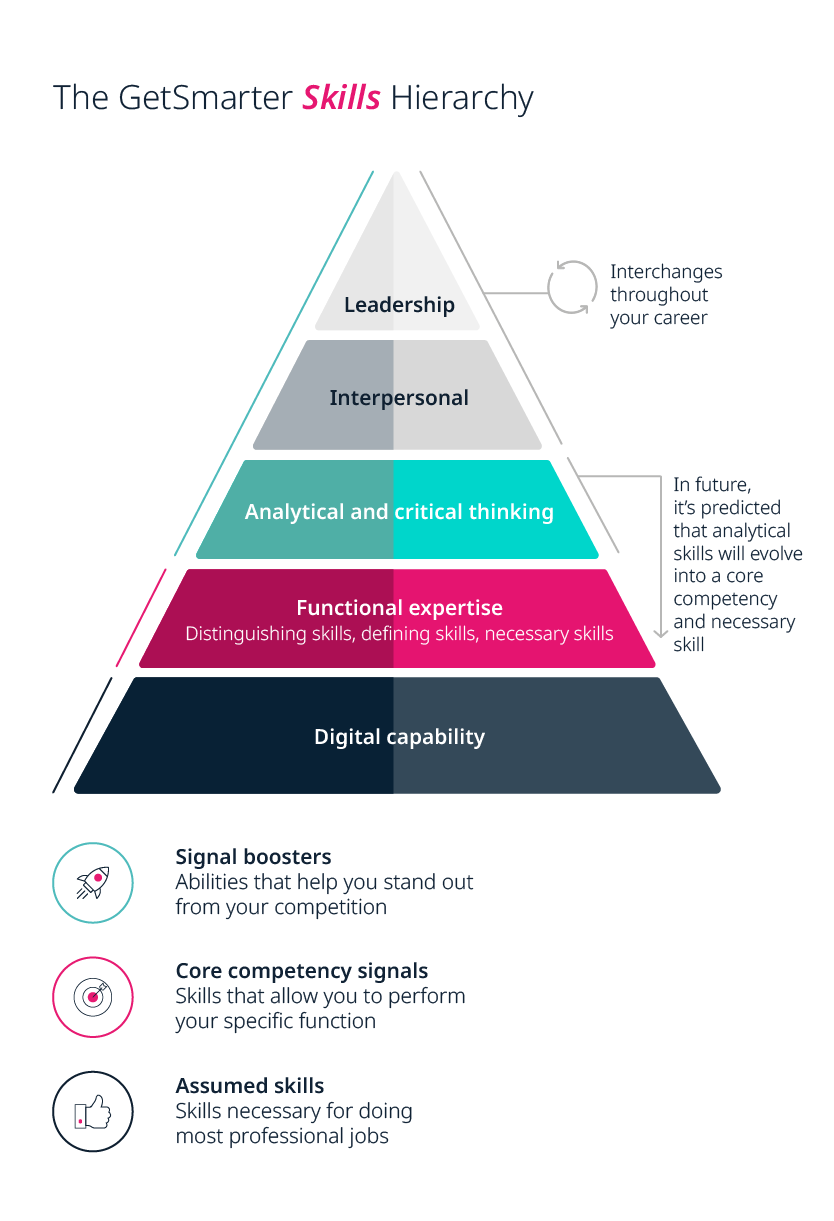 Organizations need to ensure that education and employment are fit for the needs of a changing world, one where new skills and learning are a continual part of a professional’s life. The GetSmarter Skills Hierarchy offers five key areas as a guide for where the workforce may need to upskill or reskill in the near future in order to stay relevant.