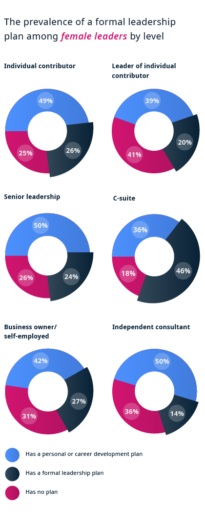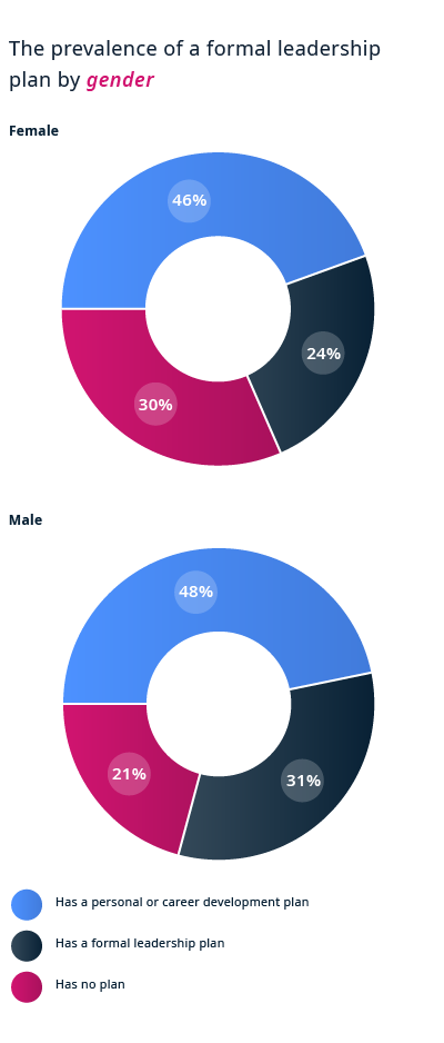Drill down into the detail and the research reveals that female leaders of individual contributors are the group most likely to be without any sort of development plan (more than twice as likely as their male equivalents). This may be indicative of a ‘broken rung’ at the first step up to manager, where only 86 women get promoted to manager for every 100 men.1