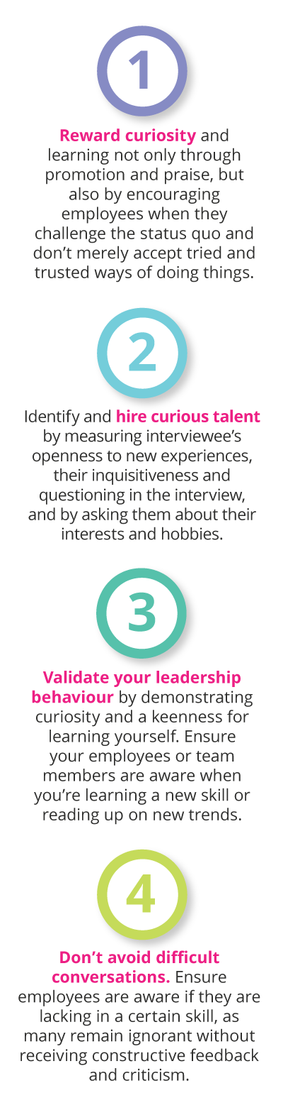 With the rise of technology comes an increase in the need for skills businesses didn’t know they needed a few years ago. According to World Economic Forum’s “The Future of Jobs Report 2018”, 133 million new job roles are forecasted to emerge by the year 2022.23 Employers are now demanding curiosity and learnability in the work environment, while employees are demanding the opportunity to adapt one’s skill set to remain current and employable. Harvard Business Review gives four recommendations on how to create a learning culture:24