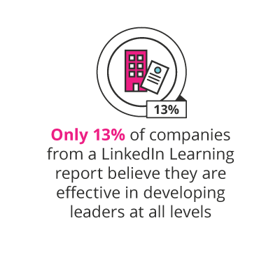 Although employees with leadership skills are in high demand, companies aren’t confident when it comes to training their existing staff. Only 13% of companies from a LinkedIn Learning report believe they are effective in developing leaders at all levels.9 Research has also shown working professionals are moving from one company to the next due to poor management performance, with employees being four times more likely to leave a company if they rate their manager as having poor performance.10