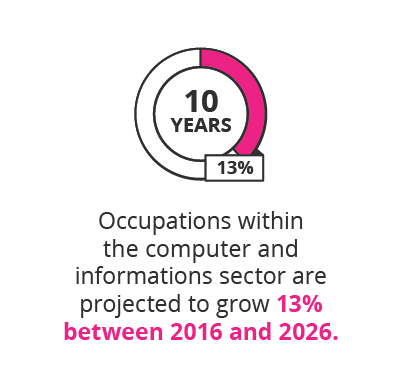 Occupations within the computer and informations sector are projected to grow 13% between 2016 and 2026, faster than the average rate for all occupations. This is due to a greater emphasis on cloud computing, the collection and storage of big data, and information security1.