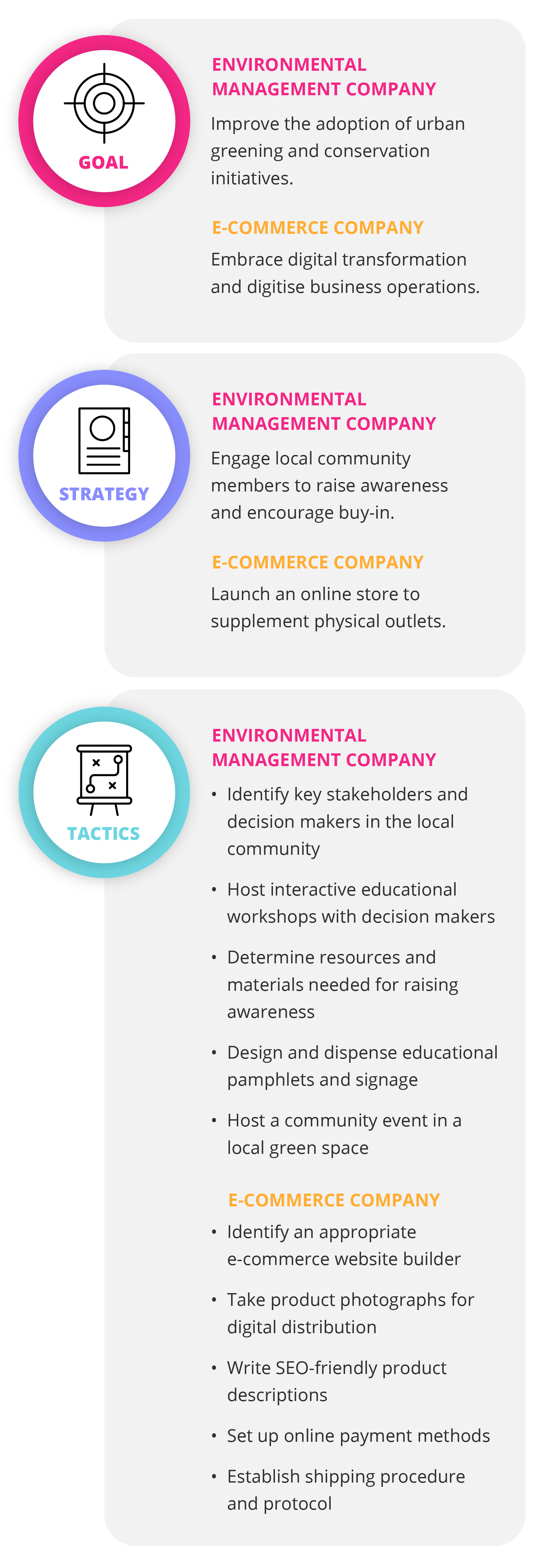 The easiest way to grasp the distinction between strategy and tactics is to see examples of them in action. Below is an outline of strategy and tactics employed in projects run by two fictional companies – the first concerned with environmental sustainability and the second with entering the e-commerce space.