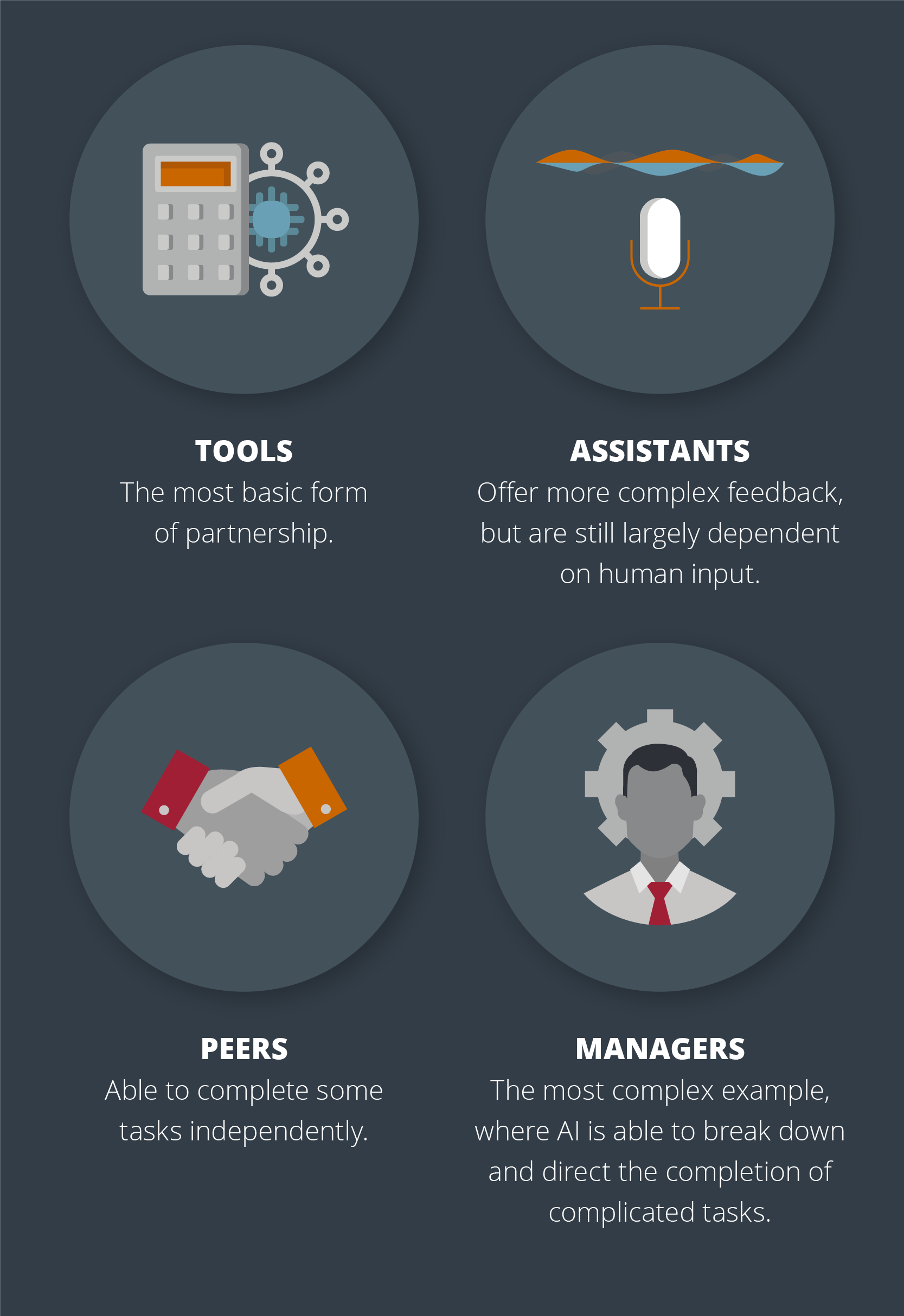 Much as a hammer is a highly specialized tool for hitting a nail, the simplest expression of the human-machine partnership – the tool – refers to AI’s ability to undertake specific, basic tasks with human input. For example, AI alone can be taught concepts, but you might not want AI to do complex and nuanced work with variables. In most instances, these tasks must be monitored throughout the process with humans, enhancing the partnership and effectiveness of using AI.